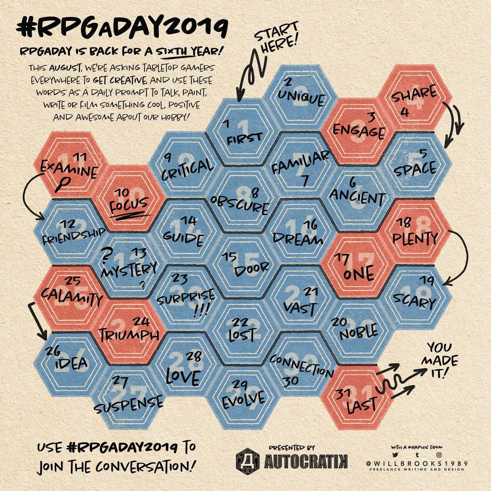 RPGaDay is an idea by David Chapman of Autocratik, and the graphic’s design is by Will Brooks. Along with the original English prompts, there are also translations to Spanish, French, German, Polish, and Swedish.